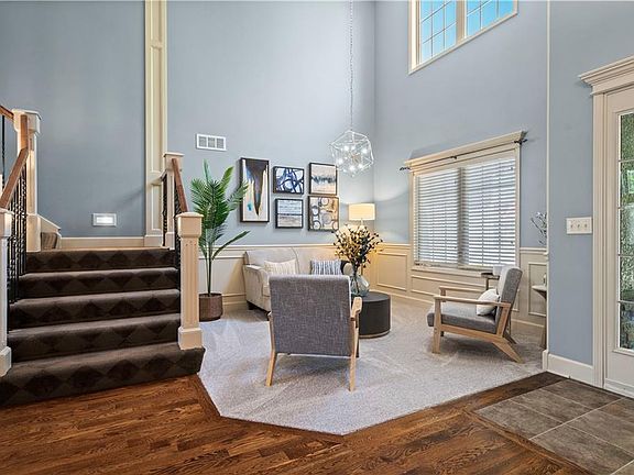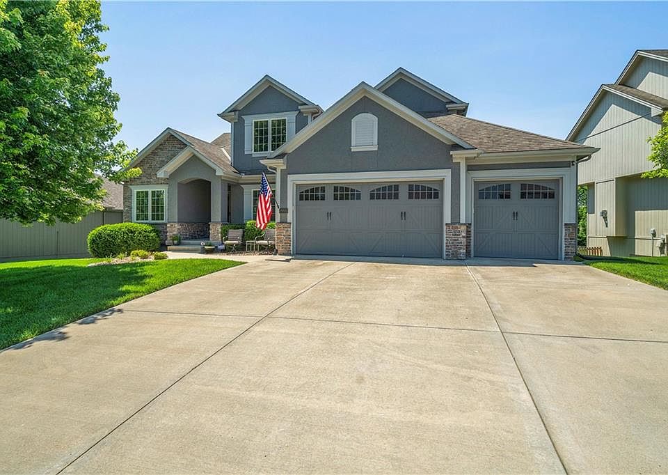 Step into this designer upgraded 1.5 story gem! The entry is a showstopper with its dazzling lighting, chic paint, and gleaming hardwood floors.  Escape into the spacious primary bedroom that leads to a swanky ensuite with a fully tiled shower, tub, double sinks, and walk-in closet! Another main level bedroom flaunts glass double doors and a lofty ceiling. Don't miss the handy laundry spot and the roomy kitchen and dining areas flowing into an airy two-story great room with a wall of windows!   The second floor boasts more bedrooms, a bonus area perfect for fun and games, a home office, or a creative corner. Step outside to the deck for some stunning views! This place is packed with cool features like surround sound, holiday lights, central vac, a fancy patio, and a lower level perfect for whatever your heart desires!  Great location close to schools, shopping and highways!  Just minutes from KCI and Downtown KCMO!  Need closing cost assistance? We're offering up to $7,500!