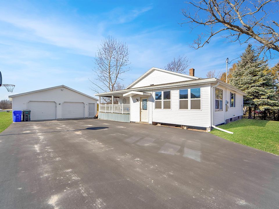 Situated on .61 +/- acre in town this charming 3bdrm 2bath home boasts an open concept floor plan. Light and bright the fully appliance eat-in kitchen includes newer cabinetry and vinyl plank floors and is open to the GR. The GR is oversized to accommodate large furnishings and has direct access to the 4 seasons room. The season's room is washed with windows and will be the favorite retreat! The primary fits king-sized furnishings!!!e Additional features include: back entry w/large mudroom/pantry area, spit bedroom design, semi-finished laundry combination full bath in LL with part plastered and painted walls, HUGE 2.5+ car garage, Covered side deck, and much more!
