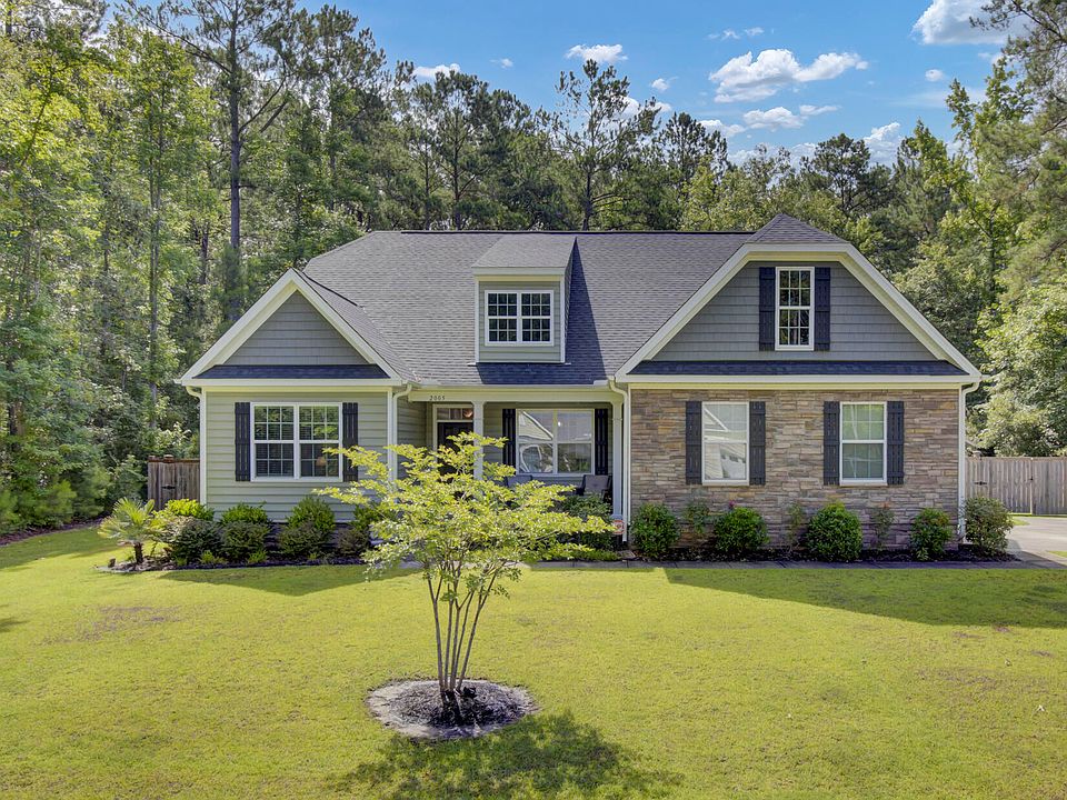 Welcome to this enchanting home nestled on a spacious 1.03 acre lot in the heart of the coveted Carolina Bay.As you step through the front door and into the light-filled foyer, you will notice the stunning luxury vinyl plank (LVP) flooring that extends through the entire home. Offering modern elegance, low maintenance, and durability. To your right, you'll find the formal dining room, a perfect blend of traditional charm and sophistication, ideal for hosting dinner parties or enjoying family meals. Moving forward, the home opens up into a bright and airy living space, seamlessly blending the modern open concept with a sprinkle of traditional elements. Don't forget to take notice of the stunning large windows that flood the home with natural light in every room.The heart of the home, the well-appointed kitchen, features sleek countertops over a spacious island, stainless steel appliances, and ample newly added storage in addition to the spacious pantry. Truly a chef's dream! Just off the main living area, tucked away in a private entry on the main level, you'll discover the cozy primary suite. This serene retreat is bathed in natural light and boasts an en-suite bathroom and two generously sized walk-in closets. Truly designed for comfort and luxury. Two additional secondary rooms on the main floor offer flexibility, perfect for family, guests, or a home office. Thought that was all? It isn't! Head upstairs to find a delightful surprise- A spacious loft area that can serve as a media room, playroom, or secondary living space. This versatile area adds a layer of flexibility to the home's layout. Additionally, you will find a full guest suite with its own private bathroom, providing a comfortable and spacious retreat for guests. Last but not least- step outside to the backyard oasis, where the new concrete patio invites you to unwind under the gazebo or enjoy a BBQ in the dedicated grilling area. The expansive yard, enhanced by a newly added privacy fence, offers both style, seclusion, and endless possibilities for both quiet mornings enjoying the sounds of nature in the woods behind, or entertaining large gatherings. This lot also provides the perfect amount of space for a pool. This home is designed for today's lifestyle, featuring the latest smart home technology for convenience and security, as well as a whole-house generator to ensure uninterrupted comfort. Nestled in the serene and friendly Carolina Bay community, this home provides the perfect blend of tranquility and accessibility, just a short drive from local amenities, schools, and major roadways. This isn't just a house; it is a forever home. Every detail reflects the love and care poured into it. Do not miss the chance to make this charming retreat your own. Schedule your private tour today and experience the warmth and beauty of this exquisite Carolina Bay home!