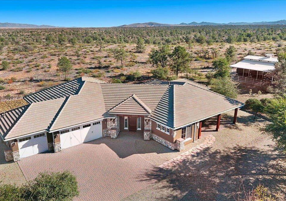 Granite Oaks, Williamson Valley, 2+ Acre Horse Property. No HOA, backs to State Lands, views of Granite Mountain, underground utilities including a share in a private water company w/fire hydrants. 3,100 sq. ft. Crystal Creek Custom Home completed in 2020 with 900 sq. ft. sealed floor 3 car garage w/built-ins, stubbed out for heat on mature treed and natural landscaped property. This beautifully appointed 3 bedroom home all with on suites, Multi-Use Room off Main Living, additional 1/2 bath, tons of storage, mudroom, laundry w/sink, includes washer/dryer and custom cabinetry. Open great room with