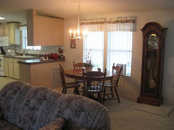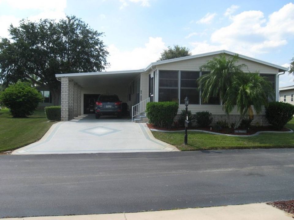 This lovely home is located in a great 55+, gated community with homes on lot leased land. It features two bedrooms, den, dining room, eat-in kitchen, tape and texture walls, and a split floor plan. The large eat-in kitchen has a plethora of cabinets, an abundance of counter space, walk-in pantry, newer refrigerator, Bosch dishwasher, and built-in microwave. The master bedroom has his and her closets and master bath features a walk-in shower and his and her sinks. The den sports French doors, a built-in computer area and built-in bookcase. There is plenty of room to entertain...or just enjoy the view of the not so distant golf course, pond and fountain while relaxing in the 10' X22' Florida room! The large deco drive leads to an oversized golf cart shed and yes, the golf cart is included! Great Home, Great Location, Great Price!
