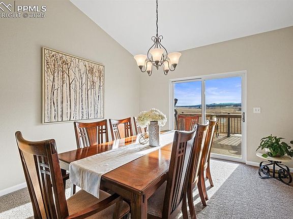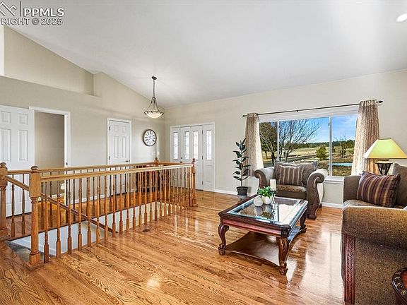 This stunning 5-bed, 4-bath home is situated on 5.3 acres of serene land, offering breathtaking views of Pikes Peak. The spacious layout includes a main floor master suite with an additional 2 bedrooms, private dining room, family and living room, kitchen and laundry, providing single-level living, while the walk-out basement offers additional living space, perfect for entertaining or relaxation. Downstairs you will also find 2 additional bedrooms and 2 large non-conforming rooms which can be used for anything, but currently work well as office space and an in house gym. Recent updates include a newly finished 600 SF deck, ideal for enjoying the scenic surroundings, as well as a new garage door, new roof, gutters and windows, ensuring peace of mind for years to come. The detached outbuilding is an added bonus in this area and perfect for RV parking and plenty big enough for additional toys, storage or projects. Mature, beautiful landscaping enhances the natural beauty of the property, creating an inviting and peaceful oasis. This home combines comfort, functionality, and stunning mountain views in an unbeatable location, Close to 1-25 and less than 15 minutes from retail shopping.