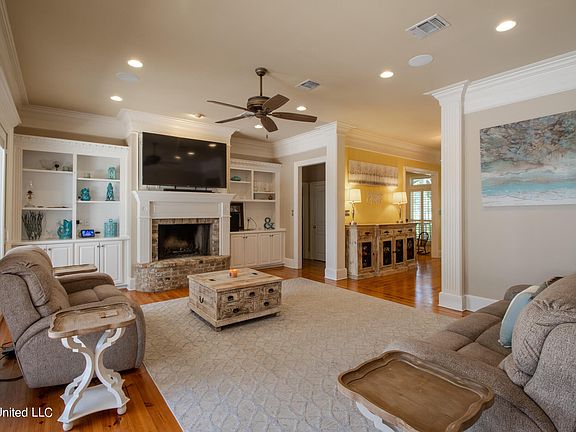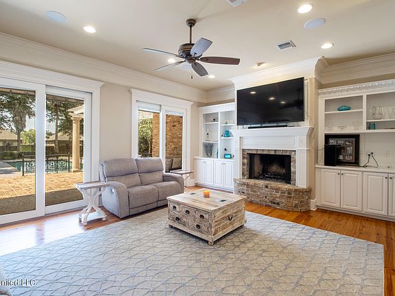 Inside, the main level boasts a grand great room with a romantic fireplace and built-in bookcases, a welcoming foyer, a formal dining room, and a study, all adorned with beautiful heart pine floors. The owner's suite is a private retreat, featuring soothing colors, a Jacuzzi Fiore waterfall tub, spacious closets, and separate shower, his and hers closets along with travertine floors—an inviting sanctuary to unwind after a long day.