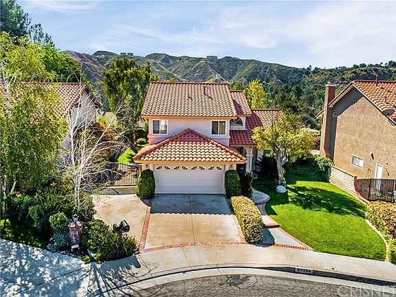 Beautiful 2 story, 4 bedroom, 3 bath, 2,144 sq. ft. Bouquet Canyon Estates home with HUGE Gated RV Parking on the end of a quiet cul de sac. This home is very clean, light and bright, and offers an open floor plan. Features include a downstairs bedroom, full bathroom, inside laundry room, direct access to the 2 car garage, tile and laminate wood floors, plantation shutters throughout, a spacious formal living room with vaulted ceilings, a formal dining room with beautiful windows looking out to the backyard, a kitchen with stainless steel appliances, granite countertops, plenty of cabinet storage, and a great view of the great room with an inviting fireplace. Upstairs are 3 bedrooms, and 2 baths. All bedrooms including the hall and stairs, have newly replaced carpeting. The master suite has vaulted ceilings, windows looking out over the backyard, and a master bathroom with dual sinks, marble tops, and a custom tile shower enclosure. The backyard is beautifully landscaped, has a concrete patio area, and there is also a HUGE gated RV parking area that is 12 ft wide at entry and 27 ft deep. With a small amount of grass removed you could extend the RV to 35 ft easily. The neighborhood and community offers much for the person seeking an active lifestyle, so be sure to take a trip over to nearby haskell canyon for a beautiful mountain top hike. NO HOA, NO MELLO ROOS.