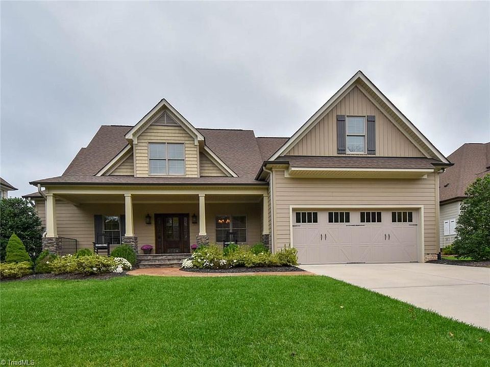 Former Chic Chateau Designer Showcase Home located in The Gates at Brassfield developed by D. Stone Builders. Main level master suite. Open floorplan with indoor/outdoor sound system great for entertaining. Indoor and outdoor gas fireplaces. Extensive moldings and built-ins throughout. Chef inspired kitchen. Refrigerator, washer and dryer to convey. Spacious upper level. Walk in attic storage. Screened porch and stamped concrete patio. Convenient location to extensive amenities, downtown and airport.
