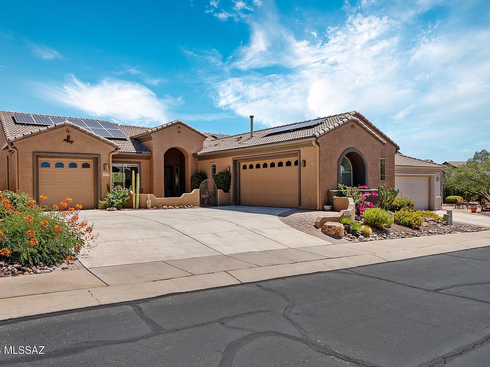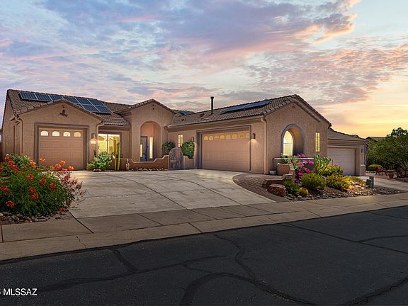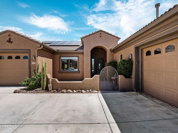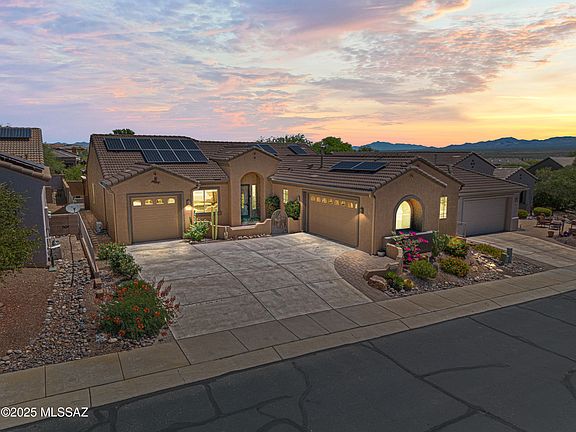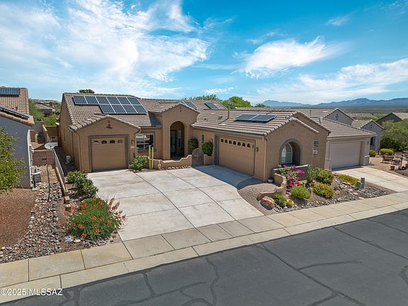 Nestled in the highly desirable retirement community of Canoa Ranch, this stunning home offers comfort, elegance, and resort-style living in a gated enclave. Step through the gated front patio, where peace and privacy for your morning coffee will start your day. Inside, the arched entryway welcomes you into the inviting great room, featuring a charming corner beehive fireplace with decorative tile and two large picture windows that frame breathtaking views of the patio and backyard. The chef's dream kitchen is a masterpiece, showcasing granite countertops, stainless steel appliances, and ample cherry wood cabinetry. The diamond pointed tile flooring throughout the kitchen and living spaces adds a touch of sophistication. Designed for both functionality and style, the home includes a formal dining area and a private office/library with built-in maple cabinetry. The serene primary suite is a true retreat, adorned with crown molding and a spacious walk-in closet. The spa-like primary bath indulges with cherry wood cabinetry, dual vanities, decorative tile, a soaking tub and a walk-in shower. The guest bedroom is equally inviting, featuring crown molding and stylish slate wood flooring. The highlight of this exceptional property is the backyard oasis-complete with a heated saltwater pool and spa, a covered patio with a twenty-foot retractable awning, a gazebo, newly installed pavers, and awe-inspiring mountain views. A three-car garage and solar ownership ensure both convenience and energy efficiency. This home embodies the finest in luxury living. Don't miss the opportunity to make it yours!