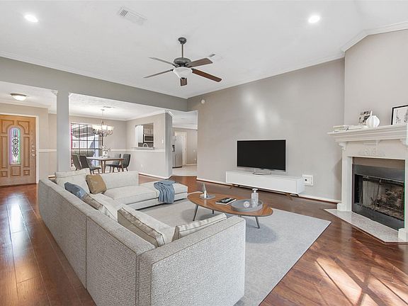 This gorgeous 4 bed 2 bath home is move-in ready! Walk into a large spacious open concept living and dining room with laminate wood flooring! Gorgeous kitchen with granite countertops, gas range, stainless steel appliances + undermount cabinet lighting! The primary bedroom has an ensuite bathroom with a jetted tub and a separate shower! This home features 10 ft ceilings, crown molding, recent paint, recent carpets, new AC in 2018, water heater replaced in 2015 and much more! Large backyard with mature trees + sprinkler system. Zoned to Kaufman Elementary + 1 block away from community pool! NEVER FLOODED!