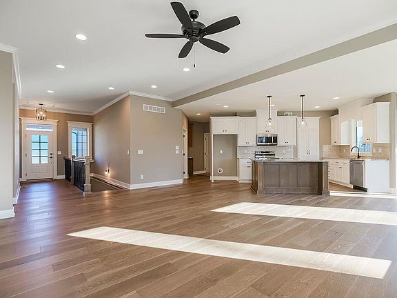 The Orvieto by Foley Construction. 30 day completion available. Fantastic 4 Bed/ 3 Bath Reverse 1.5 story featuring a 31' TANDEM garage perfect for a boat or extra storage. Home sits on a premium home site backing to trees and the community park. Unique open concept design features a stacked stone fireplace, abundance of hardwoods on the main level, granite tops in kitchen and baths, & extensive trim package. Spacious lower level has additional 2 bedrooms, full bath and wet bar. End your day on the large covered deck complete with low maintenance composite decking and black railings. The huge back yard is fully fenced with an in-ground sprinkler system included. Very popular floor plan. Standard features include 9' Foundation, I-Joist Floor System, Zoned HVAC, Large WALK-IN Shower, Upgraded carpet, Tile in all wet areas, Blown In Wall Insulation, Tyvek House Wrap, and 50 yr composition singles. Home is quality built w/many energy saving features.