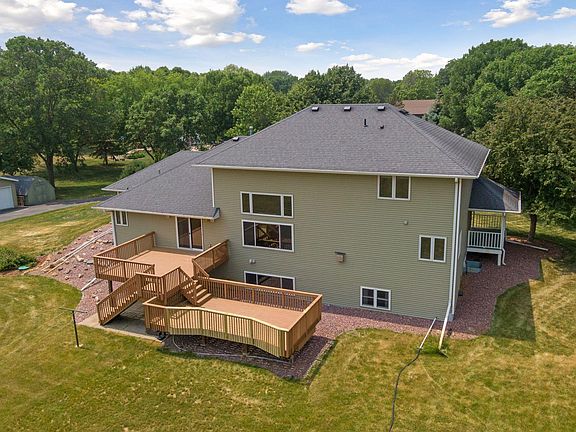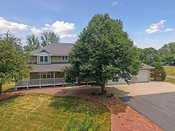 Located minutes from town this large Two Story home located in a cul-de-sac sits on a wonderful wide open 2.96 acre lot with great country views from all rooms of the home. Two story ceilings in living room, gas fireplace, main level laundry, open kitchen. Primary bedroom with large walk in closet, jetted tub & separate shower in connected bath and door leading out to the wrap around deck. Upper level features 3 bedrooms with built in desks and full bathroom. Fully finished lower level is set up with its own entrance from the garage with parking stall, 2nd kitchen, bedroom, bathroom and laundry.