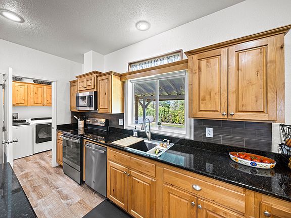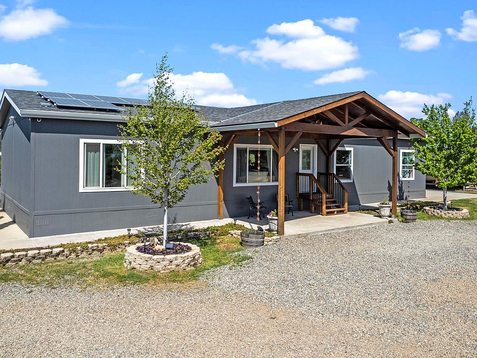 Picture Perfect East Redding home boasts pride of ownership at every turn! This spacious open floor plan features 4 beds 2 baths,9 foot ceilings throughout, updated kitchen with granite, new appliances, extensive cabinetry and counter space. Primary bedroom has lots of natural light, walk-in closet and an ensuite bath with granite, large soaking tub and separate shower. Enjoy the views of the meticulous yard with lush landscaping from the large covered back patio or from one of the many sitting areas situated around the beautifully maintained yard. RV parking/ 30 amp hookups, fruit trees, carport and firepit area, children's playground included. Complete wraparound sidewalks, new interior/ exterior paint, automatic gated entrance & solar!