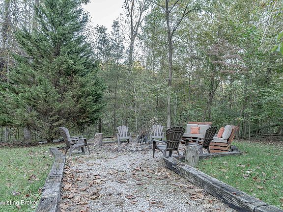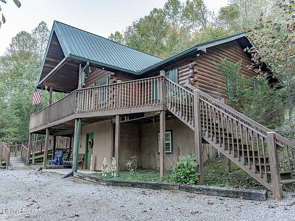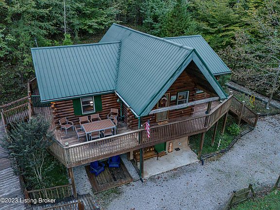 This beautiful log cabin is situated in a gated community on 3.45 peaceful wooded acres just minutes from Nolin Lake. The wrap around deck and screened in porch lends well to enjoying the outdoors and panoramic views of nature. Inside the open concept main living area features a vaulted ceiling living room, dining area and well appointed kitchen. The kitchen features updated lighting, new stainless steel appliances and warm green tone cabinetry. The primary bedroom off the main living area offers ample closet space and a large en suite bath complete with a new marble top vanity and fixtures. This floor also offers an additional bedroom and another updated full bath with laundry hookups. Climbing the spiral staircase the loft space is a great for additional sleeping quarters or would make a cozy office. Off the kitchen is an expansive screened in porch complete with ceiling fans and a view of the backyard. The partially finished walkout basement features a large entertaining area as well as an additional bedroom and bonus room. There is also a sizable unfinished portion which is great for extra storage or hobbies. Outside there is a carport, a firepit area, lots of space for parking and even a spot for a hot tub. This home is being sold completely furnished. Come see for yourself what all this property has to offer.