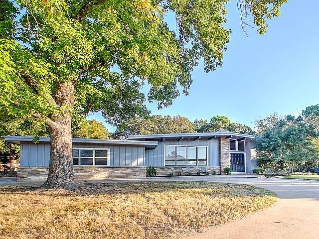 Rare Mid-Century Modern on almost two acre private hilltop setting! Modern updates, clean lines of the 1960s, ample light. Driveway leads up to commanding front entry. Split stairway bordered by a magnificent stone wall. Upstairs has living area with stone fireplace, updated kitchen with granite & stainless, dining, balcony, and two bedrooms each with bath, walk-in closet. Downstairs leads to oversized master & sitting area, divided walk-in closet. Third full bath, laundry room, storage room, impressive second living area with enormous wet bar or coffee bar, fireplace, and sliding glass doors leading to diving pool. Back of property heavily treed, backs up to Waterloo Lake area. Extensive electrical updates.