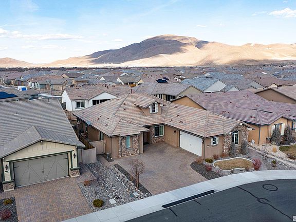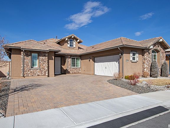 Gated Presidio Community at Damonte Ranch, 3 bedrooms, 2.5 baths, modern floor plan. Large sliders open to covered patio, spacious indoor/outdoor living space. Kitchen includes double ovens, extended island, refrigerator and microwave in pantry. Wood flooring is French Oak! Extended patio and raised gas fire pit seating area with mountain views. Sun exposure allows the for perfect patio enjoyment and room to entertain. Extended front driveway pavers and walk way to garage for convenience to the side gate., 24 hour gate house at Presidio entrance. Don't miss out this fantastic living space created for entertaining and relaxing at home. The fire pit has gas line installed to easy access tank. Paver walkways on both sides and gates to access from front yard. Garage door is insulated and floor professionally polyuria sealed. Master suite has two closets, one with 2 built-in dressers. Large master bath with soaking tub & additional tiled shower seat. Guest suites situated on opposite side of home with jack and Jill bath. Great room features tasteful wood accent wall and dining has electric heat fire glass and wood accent beams. Like new this elegant home with high ceiling and natural light it's perfect for your home enjoyment!