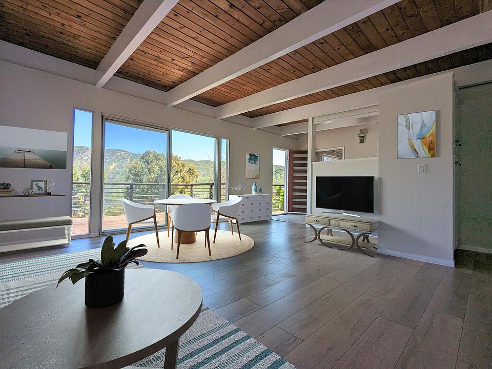 LEASED MALIBU, 90265!! Adorable 2-bedroom house for rent in the foothills above the beach and famous Solstice Canyon waterfalls. Approx. 5 minutes to the surf, 7 min. to Pepperdine, restaurants & shops, this is a freestanding cottage, NOT a guest house, nor an ADU. The home is on a corner lot for privacy, and has large upper and lower decks, 6 person spa, outdoor heated shower, fenced yard, 2 storage buildings, recently installed solar panels, and amazing views of national and state parkland. This charming interior has sweeping views, beam ceilings, French oak style wide plank flooring, solid stone counters, large pantry and all appliances, including washer & dryer, dishwasher, fridge, gas stove, oven, air conditioning and Tesla solar electric solar panels. Rent includes water, trash and gardener. Located in a quaint neighborhood, it is light and bright and has lots of mountain vistas and the neighborhood is surrounded by year-round springs and ocean views for peaceful walks and decompression! If you require furnished or short term, please text/email with your details for exact pricing. Dogs considered with "pet interview", insurance and additional monthly fee. Water/trash, gardener service included. Off-street parking. Credit and references will be checked, all tenants must carry renter's insurance/ liability coverage. Please email for lease /rental guidelines.