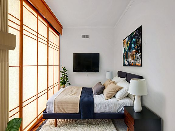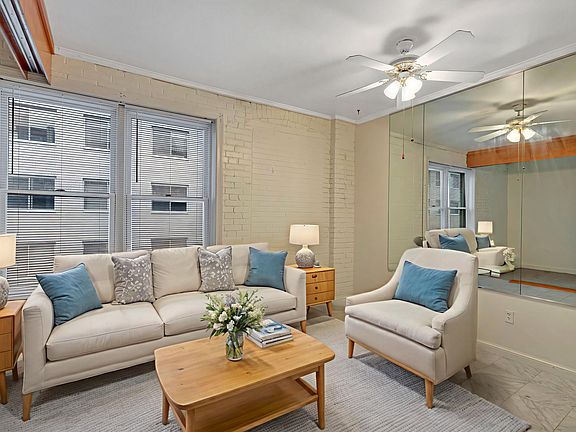 Tons of character and charm in this DC studio (405 sqft) featuring exposed brick, combination of marble tile, hardwood floor and carpet in the unit as well as sliding privacy walls for dedicated sleeping area. Depth is added to the common area with the large wall hung mirror, and boasts a ceiling fan, as well as north facing windows receiving ample natural light. Efficient kitchen comes ready with a breakfast bar, attractive tiled floor, ample cabinet and countertop space. From the foyer, you have a large closet space with built in shelving that leads to bathroom with modern fixtures and vanity.