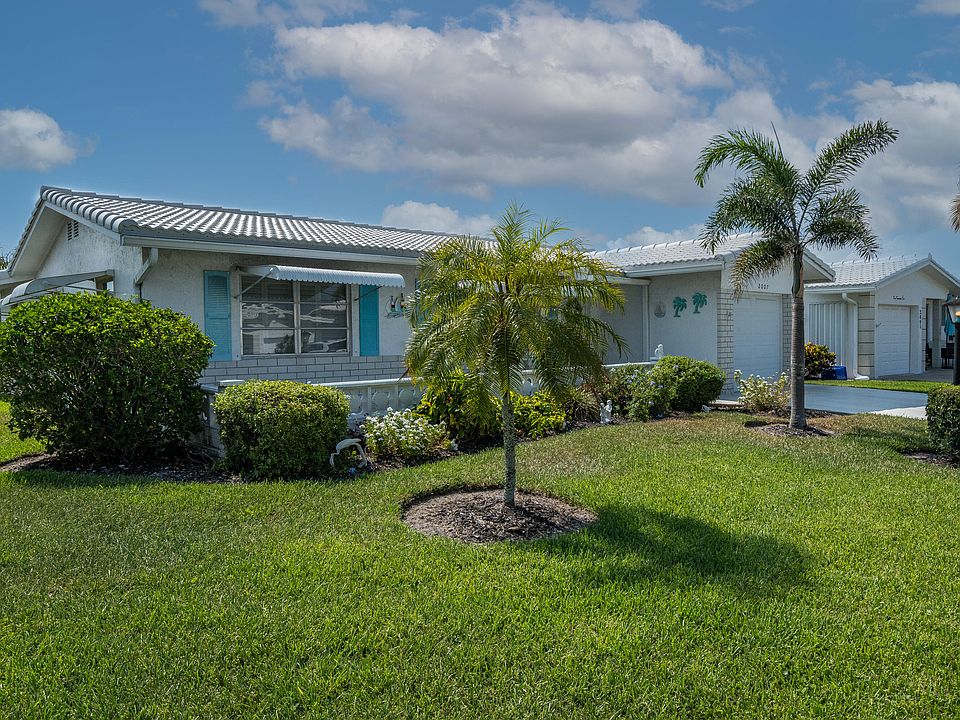Desirable Edgewood Model on quiet street. Home protected by American Home Shield Warranty for One full year after closing. All appliances, electric and plumbing systems. ROOF 2022, White kitchen, extra cabinets. Tile floors in living areas carpet in bedrooms. Slider in Florida Room opens to back yard. All windows and slider have beautiful Plantation Shutters. Large front patio.great for meeting friends. GE Electric panel & newer garage door with insulation. Hotwire TV and free Internet included in low HOA . Active 55+ community, Clubhouse, Heated/Cooled Pool/Spa, Exercise, Computer, Billiards & Card Room along with Entertainment Center. 9 Hole Golf Course, All included in low HOA fee. Pets Welcome. Enjoy a great Community (Seller will pay Special Assessment)