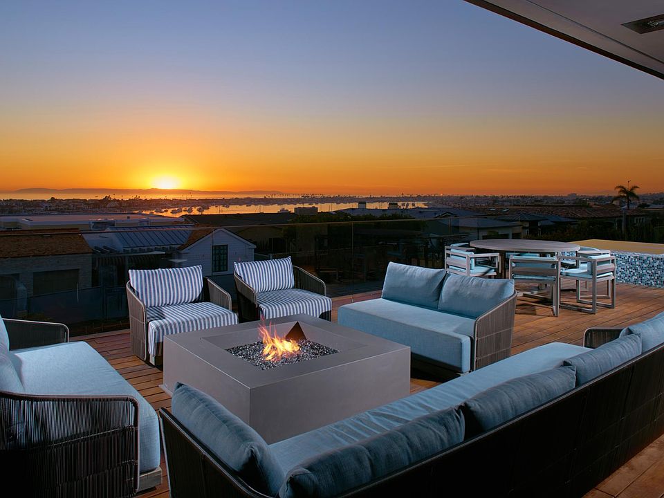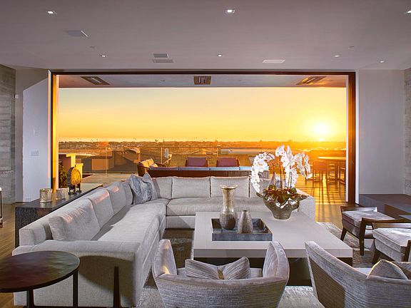 Ingenuity, style and comfort culminate in this architectural triumph by Eric Olsen Design in collaboration with Max Michelle Design Group. An alluring wood-plank bridge over a central atrium sets the tone for invigorated modern living with unrivaled ocean, Balboa Pavilion, harbor and Catalina views. Encompassing over 6,100 SF of living, the fluid, open floor plan reveals 4 bedrooms, 5.5 bathrooms, office, exercise room, and media room named "best in the world" featuring acoustic fabric walls and mixologist-approved bar with cosmos leathered granite countertops and temp-controlled wine room. Offered with designer furnishings and appointed with globally-sourced materials including Belgian French Oak wide plank flooring, Italian travertine, Seychelles genuine-shell mosaic tiles and Zimbabwe stone counters, the residence proves impossible to replicate. Beyond the great room, the professional-grade kitchen is enlivened by a polished marble backsplash and hand-aged Quartz counters. The opulent primary suite captures lay-down views and hosts a resort-style spa bath featuring dual walk-in closets and a rain shower with thermostat/volume controls. Recreation opportunities abound with abundant outdoor space from the main level deck with BBQ island, fire pit, and spa to the central atrium with integrated TV and terraced citrus and vegetable gardens. Completed in 2018, an elevator, custom LED details, EV charging, and Crestron home automation with audio, lighting and shade integrations complement the striking residence.