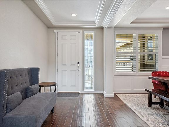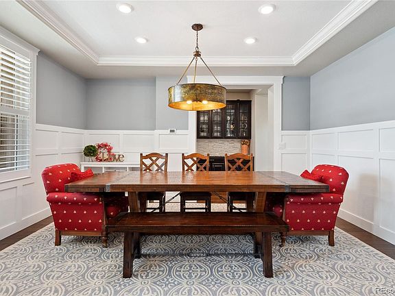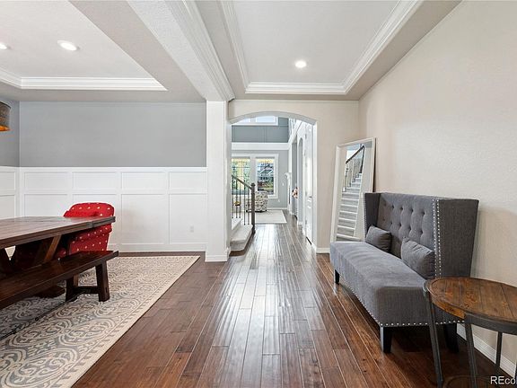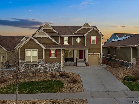 Welcome to this spacious and luxurious home nestled in the coveted Candelas community of Arvada. Lennar’s Prescott floor plan exudes a handsome and stately charm. As you step through the front porch, you're greeted by a large formal dining room, tastefully set off the foyer with a charming wood panel wall accent, setting the tone for the elegance that lies within. The open living room boasts a soaring 2-story ceiling adorned with upper wood panel accents & a cozy fireplace. This space seamlessly transitions into the eat-in kitchen, featuring an impressive tile backsplash with stainless steel accents, complemented by ample espresso cabinets. The kitchen also includes wine rack, a walk-in pantry featuring custom made shelves with rolling baskets for storage, as well as a butler’s pantry. A main-level office provides a quiet retreat for work or study. Beautiful custom stained glass privacy windows in bath and by front door. Ascending to the upper level, you'll find a versatile loft space with an attached full bath, offering endless possibilities for relaxation or recreation. Three additional bedrooms await, two of which share a connecting Jack-n-Jill bath, each equipped with a private sink and walk-in closet. The luxurious primary suite is a haven of tranquility, boasting an oversized tub and a generously sized walk-in closet. Completing the home is a full footprint unfinished basement, offering endless potential for customization and expansion. Outside, the beautiful backyard beckons for springtime enjoyment, featuring a rear covered deck perfect for watching Colorado sunsets, as well as a concrete patio adorned with a new fire table. Additional updates include brand new carpet throughout, custom outdoor iron railings, custom closet systems, window shades, shutters on all windows, and freshly painted living room walls. Conveniently located within walking distance to a large park, playground, Candelas swim & fitness club, and schools, this home is move-in ready!
