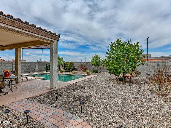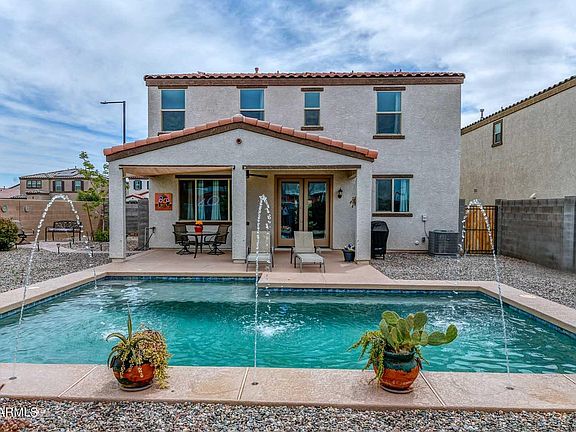 ***The buyer may qualify for a $5,000.00 lender grant, seller may also provide an additional $5,000.00 credit for closing costs*** Live in one of the quietest and secure neighborhoods in Buckeye. Close to Elementary school and 5-10 minutes off the I-10 Freeway. This 3 bed, 2.5 bath property offers a low-care landscape, a beautiful trees, swimming pool and delightful interior features beautiful large kitchen and family room, large second story bonus room, neutral engineered wood flooring, a spacious living room w/surround sound inside and out. Tile backsplash, SS appliances, granite counters, a walk-in pantry, an island w/a breakfast. Perfectly-sized loft is ideal for private gatherings. Carpeted main bedroom has a full ensuite w/dual sinks. ***CLICK MORE** for more information Covered patio, sparkling blue pool gorgeous with fountains Enjoy backyard living with music piped through large stereo ceiling speakers in large covered patio, pebbletec play & swim pool, extended cool deck with water feature surrounded by beautiful trees!