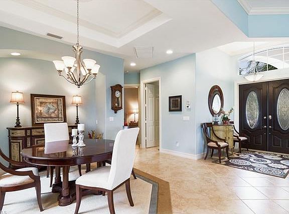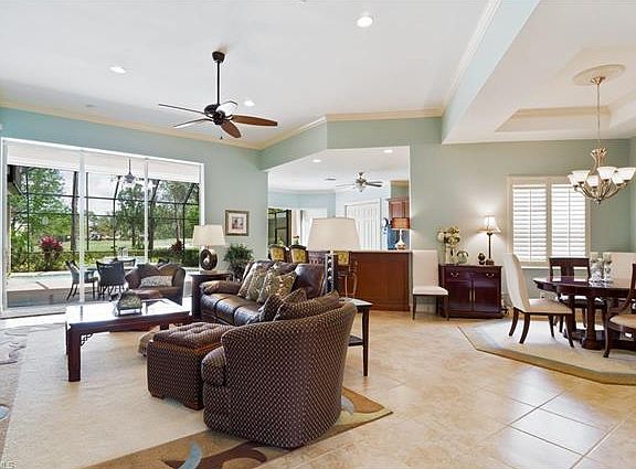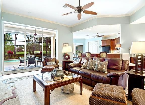 Enjoy beautiful golf course views from this 3 bedroom, 3 bath, 3-car garage single-family home in Grandezza's Villa Grande neighborhood. This home features an updated kitchen with center island, over-sized tiles throughout the main living areas, crown molding, and large screened-in lanai area with pool and water feature. Grandezza is a gated country club community offering 550 acres of home sites, beautiful lakes and preserves. Residences are built around the gorgeous 18-hole Darwin Sharpe III designed par 72 golf course, which is a natural sanctuary for oak and pine trees, marshes and wildlife species. An elegant, recently redecorated, 53,000 square foot clubhouse offers dining, a junior Olympic-size pool, pool-side restaurant for food and drinks, spa, pro shop, fitness center, 6 Har-Tru tennis courts and walking paths.