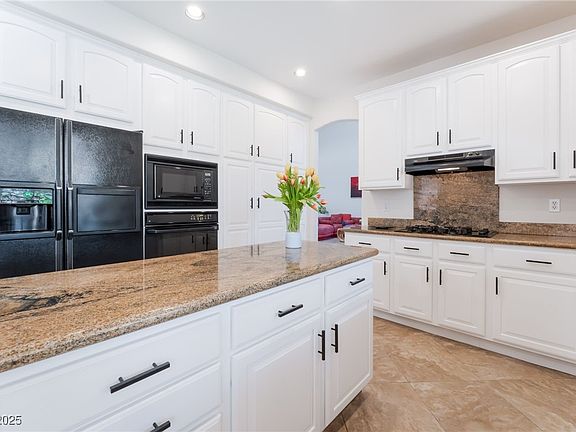 Own your dream home in the upscale community of gated Canyon Oaks in Summerlin! This luxurious 3200 sq ft home has 5 beds, 3 baths and a large office space. Step inside to grand cathedral ceilings in the formal living & dining rooms,dual entry staircase w/1 bed & bath d/s. D/s features porcelain tile, upstairs is engineered dark wood, fresh interior paint, spacious family rm w/built in media ctr w/fireplace. Gourmet kitchen features granite counters, island, bkfast area, & ample cabinets. Office w/hardwood floor has custom built-ins. Outside is your private backyard oasis w/sparkling pool, spa, lush tropical mature landscaping, grill w/mini fridge, & covered patio w/cabana curtains. Retreat upstairs to your luxurious primary suite, spacious balcony w/scenic mountain views, fireplace, & his/hers walk-in closets. En-suite bath w/travertine flooring, soaking tub, shower & vanity. 3-car garage w/epoxy flooring & built in cabinetry. Freshly painted driveway & pool deck.