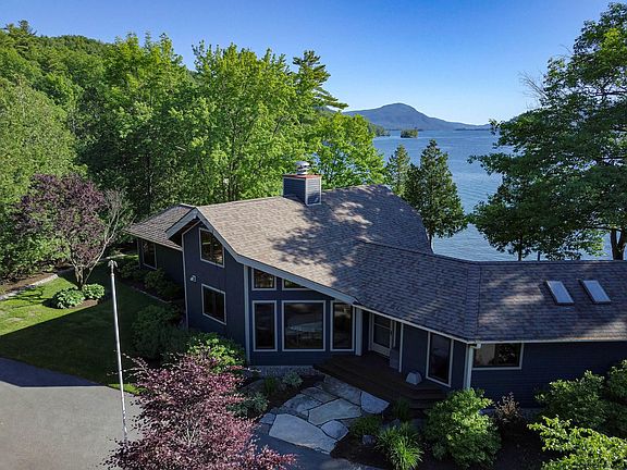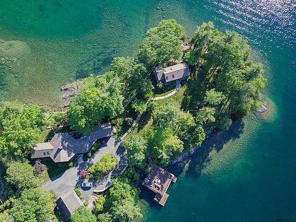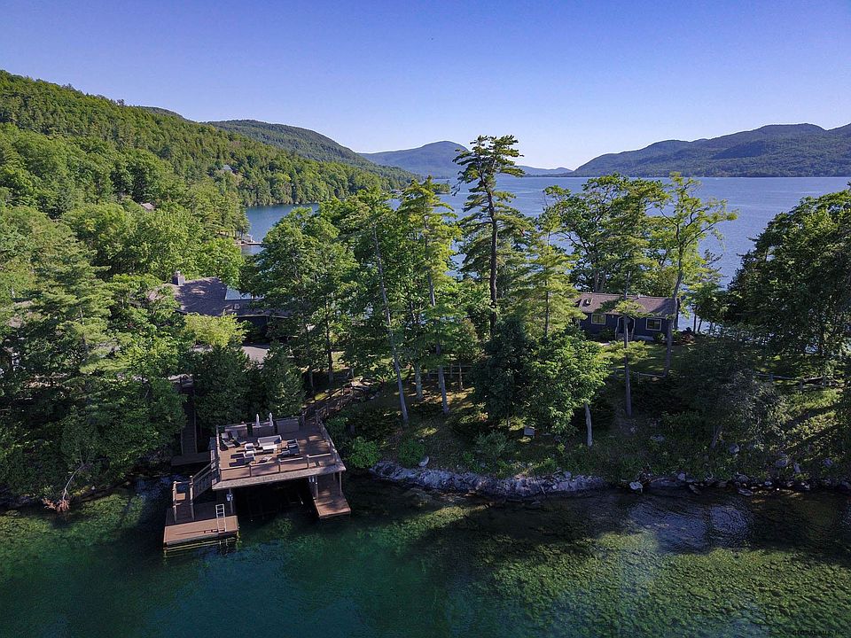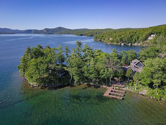 Magnificent Lake setting on a peninsula with new 4 slip dock complex on the south side and a covered , 2 slip boathouse with deck on the north side. Sandy swimming. Firepit at the end of the point. Panoramic lake and mountain views from this stunning contemporary home recently remodeled. New gourmet kitchen with high-end appliances. Open fireplace in the center of the Great room. Includes a 3-bedroom cottage with Adirondack pine interior. Two car garage with second story knotty pine interior studio apartment. Situated on a peninsula with 880 feet of shoreline and professionally landscaped grounds with gardens complemented with lush gardens, featuring many perennials. Extra parking and leach field on separate .65 acre parcel. A pleasure to show, and one of a kind!