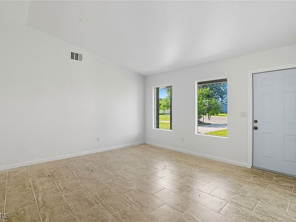 Inside, you’ll find a bright and open layout with modern updates throughout. The kitchen is complete with sleek stainless steel appliances, crisp white cabinetry, and ample counter space, making it both functional and stylish. Neutral tile flooring flows seamlessly through the living areas, creating a clean and inviting feel.