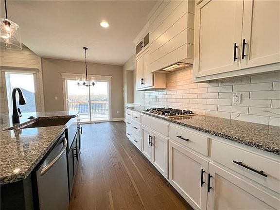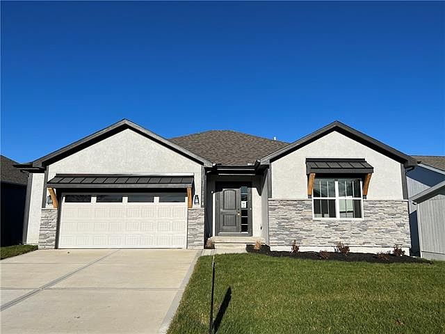 The "Torrey", a new ranch plan by Elevate Design + Build, located in Raymore's premier 55+ maintenance provided community, Alexander Creek. Kitchen has pantry, lots of cabinet space, island, granite counters, wall oven and gas cooktop, and is open to the great room with tall ceilings and fireplace. Master suite has wood beams in the ceiling vault, double vanity in the bathroom, and large walk-in closet. Finished basement with daylight windows, family room, 4th bedroom, a full bathroom, and plenty of space for storage. Full yard irrigation system.