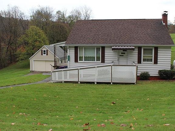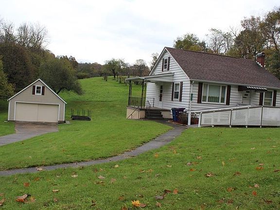 Pride of Ownership shows throughout this "One Owner" 4 bedroom cape cod home. Amazing 5.3 acres are beautifully maintained and are approximately 80% cleared. The partially covered Trex deck and ramp leads you to the front door where you will enter in to the living room that has a beautiful hardwood floor. There is a spacious eat-in-kitchen featuring plenty of oak cabinets, electric stove, refrigerator, dishwasher and side door that leads to a covered side porch that is perfect for year round grilling! The master bedroom and second bedroom have over head lights and nice closet space. The upper level has 2 additional bedrooms where you will find several storage areas, one evennhas built-in drawers. The walk-out large basement has 8 foot ceilings, a bomb/tornado protection/storage room, root cellar for additional storage, toilet and plenty of usable area. Additional amenities include PUBLIC WATER, access to well water, oil furnace which includes 550 gallons in 2 tanks and optional whole house wood stove heating.The 2 car detached garage, with sliding barn doors, is wired for electricity but not connected to the house, and has a second floor loft! Plenty of orchard trees, grape arbor and berry bushes. Great location!