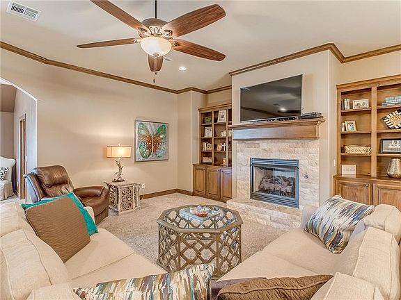 From the pages of Restoration Hardware, you will not be disappointed in this gently lived in home. Gorgeous travertine look tile in Entry, Kitchen, Dining, Baths, & Laundry. Custom cabinets with chef's Kitchen featuring antique glaze over painted finish w/ complimentary distressed island & raised bar w/ designer paint finish. Granite slab counters w/ tumbled stone splash. Stainless appliances include gas range. Under cabinet lighting. Pantry. Corner under mount sink w/ double window giving a panoramic view of the backyard. Oversized living w/ gas log fireplace and tumbled stone surround, matching bookcases, & crown molding. True Study for work at home professional. Large Master Suite w/ separate tile shower & tub. Incredible wrap around walk-in closet for great storage. Plantation shutters & 2" blinds. Designer lighting fixtures throughout. 250 sq. ft. cov'd patio for outdoor entertaining. Prof. landscape & full sprinkler! Beautiful home!