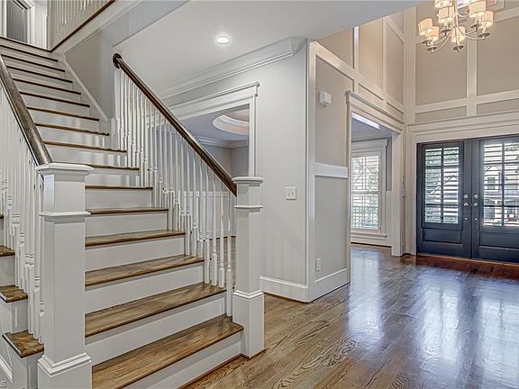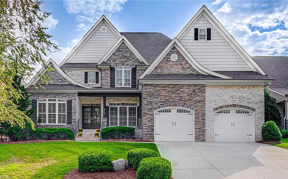 Former Parade of Home home has attention to detail with extensive trim details, beautiful hardwood floors & plantation shutters. Beautiful 2-story foyer & great room w/gas log FP & ceiling fan opens to kitchen w/huge island, solid surface counters, custom vent hood, double oven, gas cooktop, abundant cabinetry, walk-in pantry plus built-in seating in eat-in breakfast area. The formal dining room boasts a fabulous custom ceiling. A huge primary suite w/custom ceiling, bath w/HUGE shower, dual sinks, jetted tub & custom walk-in closet is a perfect place to relax. A bedroom/office adjoins a full bath & a fabulous drop zone & spacious laundry w/sink complete the ML. Upstairs enjoy 2 bedrooms, 2 baths, plus loft & versatile bonus room. The walk-in floored attic is great for storage with expansion potential. A rocking chair front porch & covered patio make for great entertaining. Oversized 2 car attached gar. All located convenient to shopping (Trader Joe’s), Battleground Ave. & Hwy 840.