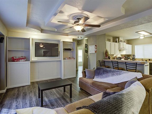 Take a look at this well maintained home! Located in a well maintained park, with clubhouse, pool and other great amenities. The home has beautiful tray ceiling in the living room will catch your eye. There is much to admire, from the ceiling, the wood flooring, the living room built-ins, the tile flooring in the dining area and kitchen. The kitchen has a breakfast bar with lots of cabinets and prep area. 3 bedrooms, 2 full bathrooms and laundry room round off the list of features inside. The rented lot is fully fenced. Call for a private showing today. This home won't be on the market long.