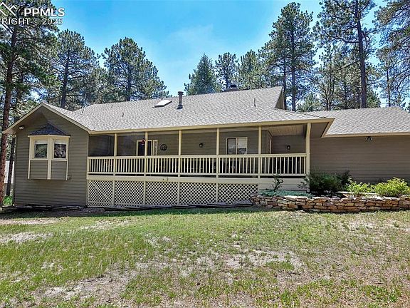 Tucked on a quiet wooded street on over 3/4 acre in highly desirable North Woodmoor, this completely updated walk-out rancher is a Colorado dream come true! Covered front porch complete with porch swing opens to vaulted entry with sky light, closet with built-in cubbies and gorgeous hardwoods that run throughout the main level. Open concept kitchen features extended height soft close cabinets, granite counters, subway tile backsplash, deep sink, island with counter seating and storage, walk-in pantry w/granite counters & built-ins, and new dark stainless appliances including double oven gas stove. Attached dining area has raw wood accent wall. Main level walk-out family room has stacked stone wood-burning fireplace with stone hearth and custom wood mantle. Hand crafted wrought iron & wood railings stand out against two-story floor to ceiling windows that let the natural wooded beauty in. Small living room off entry is perfect for quiet conversations or cuddling up with a book. Double door entry opens the vaulted master bedroom with transom windows, his and her walk-in closets w/built-ins, and stunning attached master bath w/over-sized soaking tub, and walk-in shower. 2nd large vaulted main level bedroom with bay window, and full bath with granite counters. Roomy lower level landing (10x6) leads to enormous remodeled walk-out recreation room with storage closet. Two more sizeable bedrooms on lower level, along with a 3/4 bath, enormous storage/utility room currently a home gym, and a Laundry room with utility sink, built-ins and washer/dryer. Finished oversized 2 1/2-car garage w/shelving, storage and standing freezer. Whole house air filter, central air, smart light switches, custom cordless shades throughout, Nest smoke and CO detectors, up graded screened gutters, keyless door locks, invisible dog fence, raised flower beds. Entire home painted two years ago. Quick access to Woodmoor Golf and Country Club, as well as I25, hiking trails, Monument, and Palmer Lake.