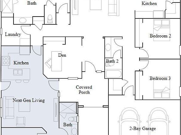 This single-story residence is a Next Gen® home design that is perfect for those who need space, with an attached suite that features its own kitchenette, living room, bedroom, bathroom and private entrance. In the main home is an open concept living area surrounded by three bedrooms, including the owner's suite, a study and a covered patio.