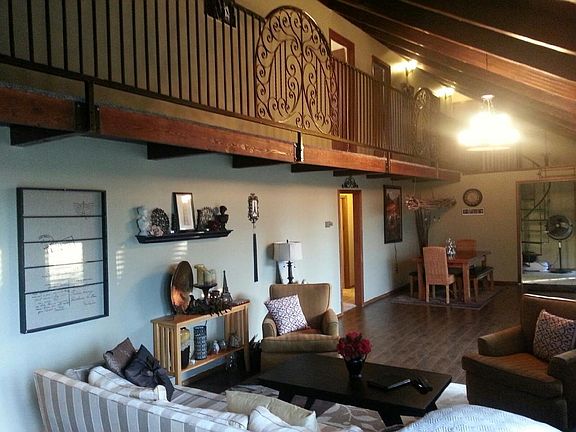 Unique home that's perfect for entertaining inside or out! Tongue & groove vaulted ceilings w/exposed upper level. Main floor has spacious LR, formal DR, utility rm, bath & FR. Small room w/extra fridge, cupboards, & counter off the FR makes it a great area for gatherings. Upper level has mstr w/dbl closets & full bath. All BR's have a slider to balcony. Xlg covered deck.