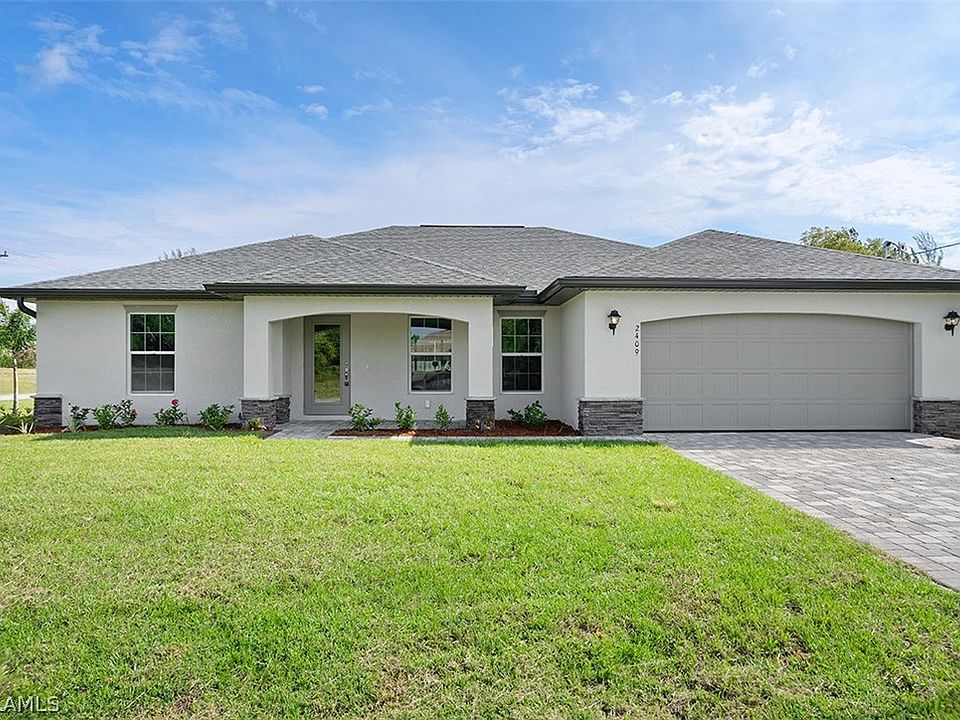 on front elevation of the home, irrigation system, epoxy coated garage floors, upgraded to paver driveway. Pictures