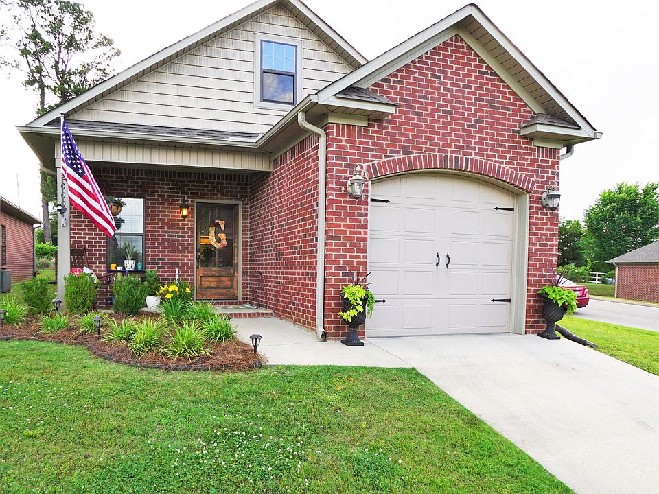 Easy living in this 3 br/2 ba brick home with tons of UPGRADES! Beautiful custom lighting, gorgeous hardwood floors and great colors. Open plan, kitchen features marble-look counters and stainless steel appliances (Fridge included). Master br has two closets, tray ceiling, and big master ba with shower and separate tub. Huge corner lot with private brick courtyard. Single car garage attached. Lawn care provided. Estimated taxes with regular homestead = $1324.00. All subject to verification.
