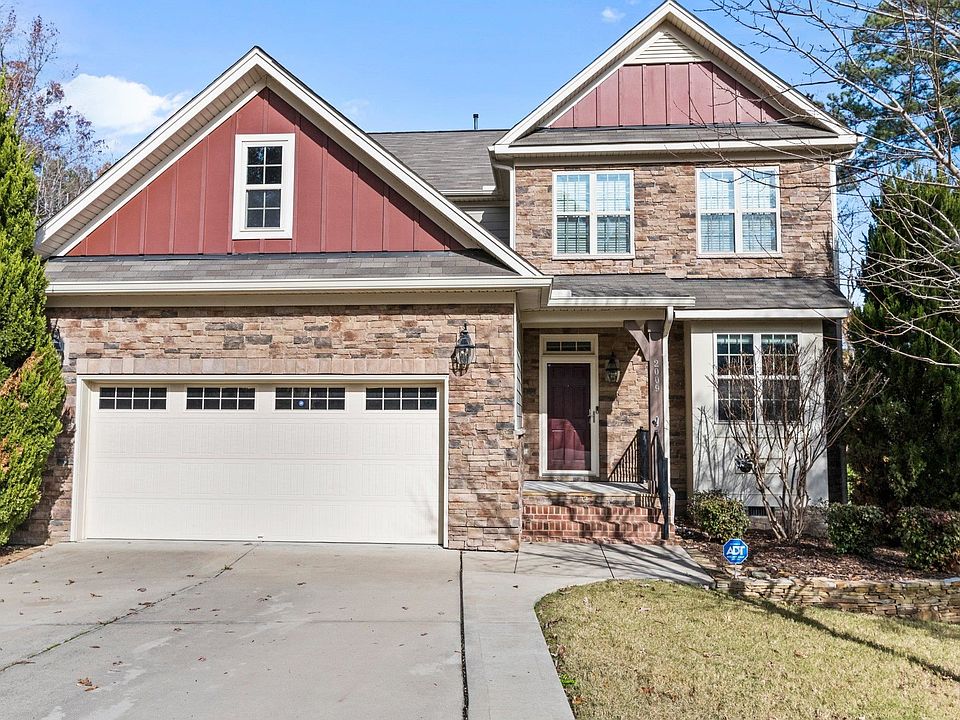 This beautiful Bella Casa home is ready for new owners! Located at the end of a cul-de-sac with adjacent lawn common area maintained by the HOA, this home offers tons of privacy. Large office with French doors near entrance, leading to open concept kitchen, dining room and family room with gas log fireplace, gleaming wood floors and built-in speakers. Just outside is an expansive deck overlooking the private fenced backyard. First floor guest bedroom and full bath and a laundry room with washer and dryer. Upstairs is a huge bonus room/loft, two additional bedrooms, hall bath with dual sinks and the primary suite with a soaking tub, separate shower and walk in closet. The garage has built-in cabinets and drop zone, additional storage above the garage door and a mini-split HVAC unit in case you want to use the garage as a gym or workshop. The community features three pools, tennis courts, clubhouse, and close proximity to Apex Nature Park.