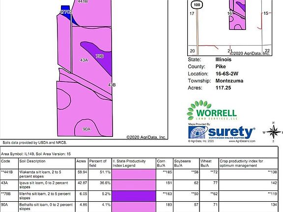 Here's your chance to snag a highly-productive Class A farm in one of Pike County's strong agricultural areas! This 122.45 acre farm is 96% tillable (117.25 tillable acres according to USDA) and carries a very strong Productivity Index Rating of 138. A great producer, the farm raised 80/bushel beans in 2019. The southern 40 acres will be pattern-tiled on 40' centers with 4" tile this fall. The waterway that runs through the farm could be an excellent conduit for future tiling projects, as well. The non-tillable acreage offers an 8,000-bushel grain bin, a hay shed, and plenty of space for additional bins and improvements. The current owner would enjoy the opportunity to keep farming and would gladly discuss possible lease terms as part of negotiations. Seller also has an additional 162.01 acres for sale just a couple miles from this tract. If you're in the market for more acreage, see MLS#CA1002845 for details on that tract.