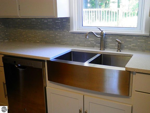 This charming, vinyl sided home is larger than it looks! 3 bedrooms, 2 full baths. Open floor plan between the kitchen, dining area and living room. Wonderful kitchen with white cabinets & stainless steel hardware. Also a newer stainless steel double farm sink, gas range, built-in microwave and dishwasher! ''Stellar snow'' quartz counter tops, glass tile back splash and reclaimed wood look tile accents are beautiful! 2 bedrooms on main floor plus a nice bedroom upstairs. Main floor master bedroom has private bath. Covered front porch plus back deck and concrete patio with electric to add hot tub. Fenced yard. Attached insulated garage has a huge storage area behind and its own furnace. Hi-efficiency furnace & central air. Full, clean basement. Refrigerator for kitchen is in garage.