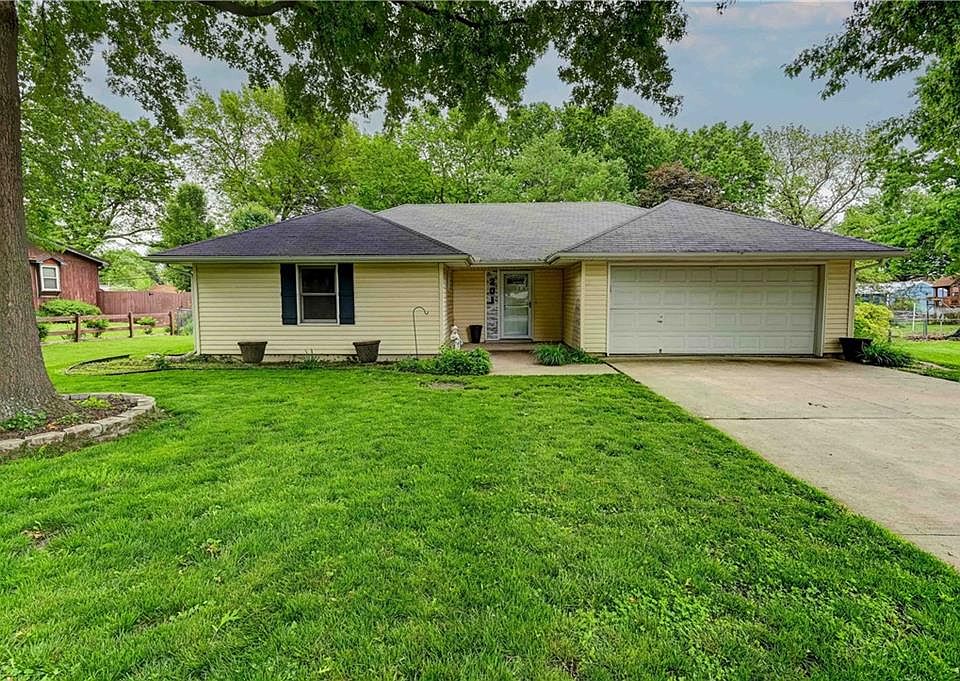 Move in ready -- ranch style home with over sized two car garage! Low maintenance exterior with vinyl siding, Large fenced backyard with 10 x 15 storage shed. Many updates in the past few years with LVP flooring thru out kitchen and living room. updated kitchen with countertop, backsplash and large single bowl sink. Enjoy the enclosed back room with plenty of natural daylight and electric fireplace for enjoyment all year long! Spacious bedrooms and laundry off hallway. Small town living but convenient location close to highways, shops, dining and Top Rated Lee's Summit Schools!