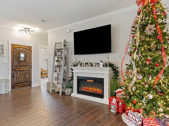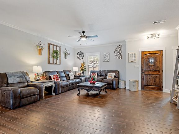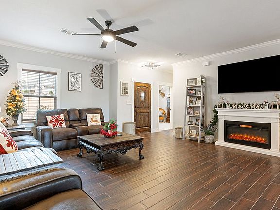 WHOAAA..this custom built home is calling your name! Lets start by a garage that fits a lifted F250 full size truck. Home has the luxury of many custom features: Brick Wall in the Dining Area, Kitchen is designed to be a chefs dream or all the bells and whistle plus georgeous country and modern looks with clean lines. Hard Tile that has the appearance of wood. The open concept allows everyone to be together and a perfect entertainment area. 4 bedrooms with 2.5 baths. (Jacuzzi Tub in guest bath) The Master Bath is a fairytale area with loads of storage space and walk in closet. It opens into the Laundry room, with Large Kitchen pantry also located behind kitchen. Mud area located as you enter into house from garage. Back patio has 3 sided sun blinds and outdoor kitchen with light and fan. You can sit and take in the ENORMOUS back yard that is partially fenced, the rest of the property to the creek is outside the fence. There is storage building in back (electric to back of property) and raised Garden beds. Hot tub off the side of the covered patio! This house is one that you do not want to miss!