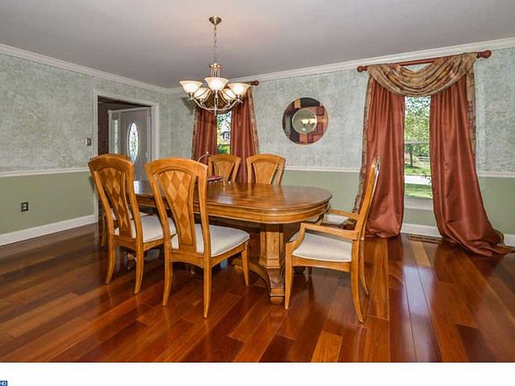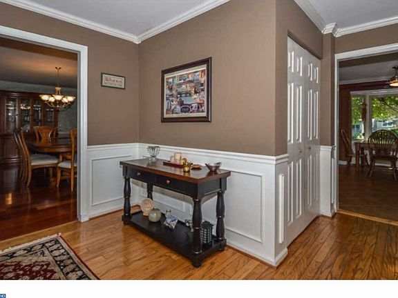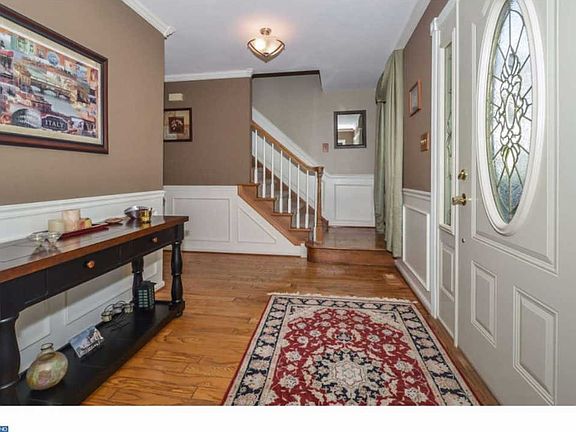 This Beauty is a "10"! Pull up to this brick front colonial & be very glad you did! The manicured lawn is a clue to how great it will be once you enter. The formal foyer with its Victorian oval leaded glass door with matching sidelights has hardwood floors, wainscoting, chair rail, crown moldings and a double coat closet. To the left is the large living room which is currently used as dining room with Brazilian cherry hardwood floors, crown molding, chair rail and upgraded light fixture. Continue into the dining room (being used as office) also with Brazilian cherry hardwood flooring, ceiling fan with light, crown molding and atrium sliders to pool patio. The kitchen features ceramic tile floor, stainless steel sink with goose neck faucet and soap dispenser, granite counter tops, gas stove, wine refrigerator, recessed lighting, walk in pantry, casement window over sink, built in microwave. The eat in area has bay window with full view of lovely backyard, a ceiling fan with light plus wainscoting and a pass through to super size family room. The floor to ceiling brick fireplace is flanked by 2 long windows with plantation blinds. The high wainscoting adds a touch of elegance to this room with its wood beamed ceiling and opening to the wet bar. There is also an atrium door to a large deck overlooking the very inviting in ground pool with diving board. There is also a paver patio with a built in fire pit and a well appointed shed. The gardens are trimmed with a paver wall in this fenced in yard. Completing the main level is a large laundry room with its own outside entrance, a powder room with pedestal sink and entrance to the well maintained two car garage. The master suite on the second level has a ceiling fan with light, walk in closet with atrium door as does the master bath. Start or end your day in this room with a vaulted ceiling and skylight, upgraded vanity with state of the art bowl and faucet, soaking tub, separate shower, ceramic tile floor and tub surround,linen closet with mirrored doors, track lighting and upgraded light fixture. The other four bedrooms each have large closets and are carpeted. The hall bath also has a vaulted ceiling with a skylight plus double sinks. The hall has pull down stairs to attic. Not finished yet!! The lower level is finished and features a stand up bar and recessed lighting. Additional storage is available under the steps and in utility room. 20 minutes to Skippack Village, you will not be disappointed!!