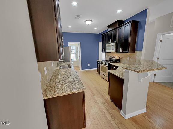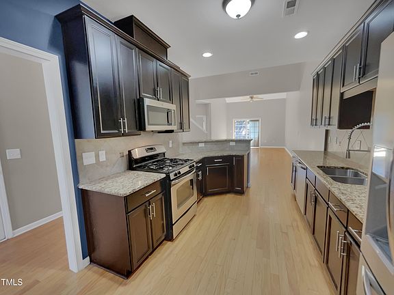 Welcome to your new home in the heart of Holly Springs! This charming townhome with a 1-car garage is nestled in an excellent location that's convenient to the community pool and park. The open floor plan is perfect for modern living. The kitchen offers custom stained cabinetry with flat panel doors and satin nickel pulls, complemented by stainless steel appliances, recessed lighting, granite countertops and a stylish diagonal tile backsplash. A large owner's suite with vaulted ceilings adjoins the owner's bath with designer wall color, dual vanity, soaking tub, and a separate shower. The family room has a vaulted ceiling, recessed lights, and a ceiling fan. A sliding glass door leads to a patio. The attached storage room outside provides ample space for storage. Don't miss the opportunity to make this townhome your own!