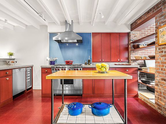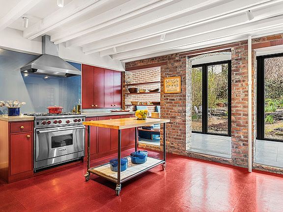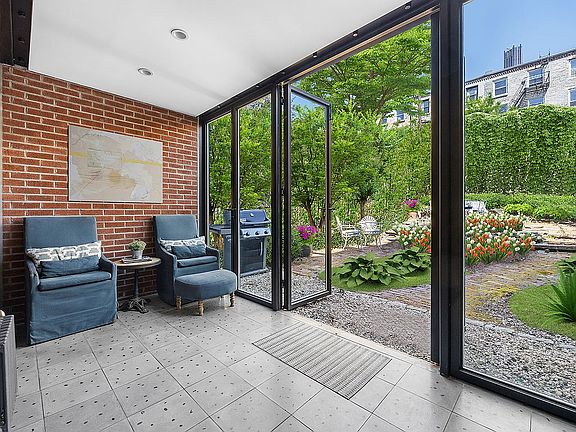 The kitchen is truly fit for a chef, boasting professional-grade appliances including a Wolf range, Liebherr fridge, Sub-Zero freezer, Miele dishwasher, Uline wine fridge, Kitchen Aid wall oven, concrete counters, and ample custom solid wood cabinetry. Adjacent to the kitchen is a charming powder room and a delightful sunroom with exposed brick walls and floor-to-ceiling glass doors that lead to the gorgeous garden, making it the perfect spot for morning coffee and reading the paper. The garden is a private oasis, measuring 850 square feet and featuring a stone patio, gardening areas, and space for relaxation and al fresco dining.