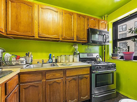 The kitchen has a window and room for a dishwasher. The bathroom has the original 1930s tile, still in excellent condition. The main bedroom is enormous, with room enough for a king-sized bedroom set and also a sitting area or home office. Plus, the second room has two windows with two exposures.