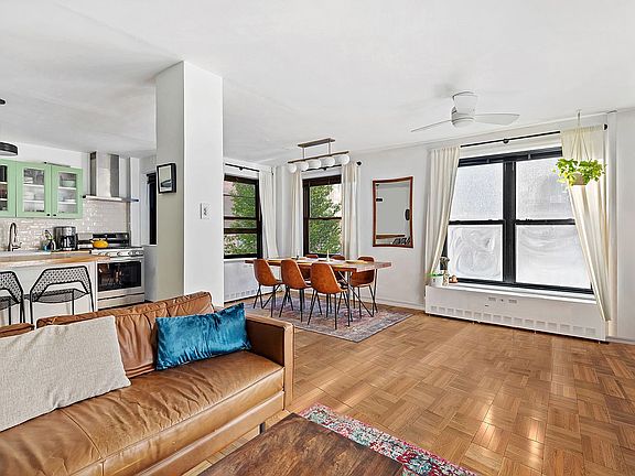 Your new home awaits you! This stylish gem in the coveted Clinton Hill Co-ops is move-in ready with thoughtful touches throughout. Overlooking landscaped common gardens, apartment 5H in 205 Clinton Avenue has been fully renovated, featuring a welcoming layout with a spacious open-plan living, dining and kitchen area – perfect for relaxing, working, and entertaining. The well-designed kitchen will delight the most discerning chef with a five-burner Samsung gas range, Miele dishwasher, and Liebherr refrigerator, as well as custom cabinets and shelves for maximum storage and workspace.