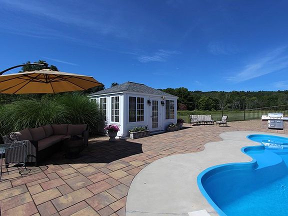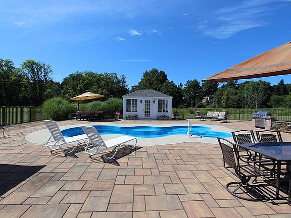 Magnificent and meticulous 4-5 bedroom, 3.5 bath colonial set on almost 7 acres is your "Resort at Home" with spa like yard and serene views! Open flowing floorplan features gleaming hardwood floors, spacious maple kitchen with stainless appliances, dining room, and living room with fireplace and glass sliders to deck. Main level master bedroom suite has walk-in closet and bath with double sinks & jetted tub. Upstairs are 3 additional bedrooms and another full bath. Looking for space for the in-laws, teen suite, au pair, or office? The tastefully finished walk-out lower level has a full apartment with wood floors and well-appointed kitchen. Your private oasis awaits in the backyard with in-ground saltwater pool, deck, patio, built-in gas grill and firepit, and pool cabana that doubles as an outdoor living room! An exceptional place to call home--exudes warmth and quality! See MLS doc's or call for complete list of updates!