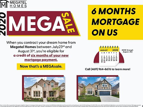 Ask about our MEGAsale promotion of 6 months mortgage on us. Megatel Homes will credit the first 6 months of your new mortgage payment. See your community sales consultant for full details. contract and MEGA sale addendum must be signed between July 23rd, 2020 through December 31st, 2020. Mortgage payment refers to principal and interest only. Additional restrictions apply. Megatel Homes reserves the right to change or cancel the program at any time.