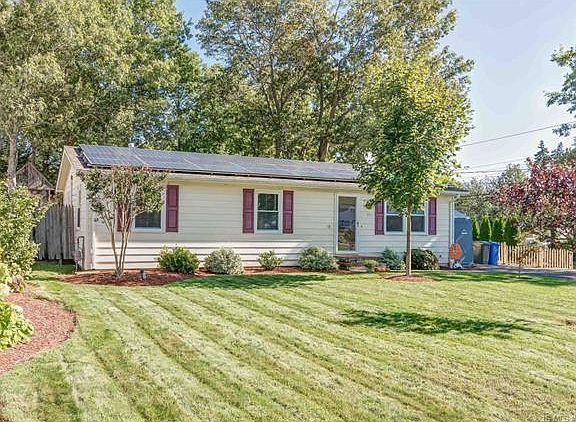 This Immaculatley presented 3 bedroom 1 bath ranch is perched up on an oversized corner lot surrounded by mature & manicured grounds. Open floor plan with light & bright paint throughout. Spacious kitchen with newer wood cabinets, generous sized island & sleek white appliances. Beautifully landscaped from maple trees to hydrangeas bordered in river rocks. Whimsical backyard lined with evergreen trees & a paver walkway leading to your perfectly placed paver patio, feeling like an oasis. Other chic features also include; thick farm house siding, recess lighting, ceiling fans, stylish trim work, pallet wall, new roof, new double hung windows, underground sprinklers & solar panels.